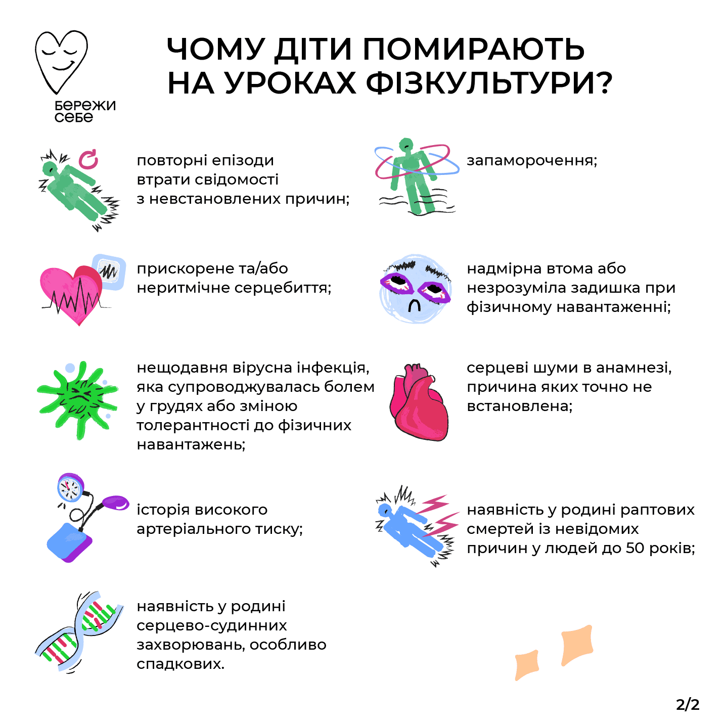 Усі батьки люблять своїх дітей та хочуть для них найкращого. Тому випадки, коли, здається, повністю здорові діти раптово помирають на уроках фізкультури, змушують переживати всіх — батьків, вчителів і суспільство загалом. Чи є такі уроки безпечними для школярів і школярок? Зазирнувши в Інтернет, можна зустріти багато недостовірної інформації з цього питання. Переважно така інформація не підтверджена медичними фактами й змушує лякатися ще більше.
