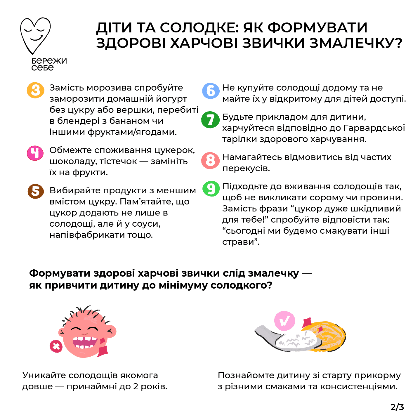 → підходьте до вживання солодощів таким чином, щоб не викликати сорому чи провини. Замість фрази: “цукор дуже шкідливий для тебе!”, наприклад, спробуйте відповісти так: “сьогодні ми будемо смакувати інші страви”. Або замість “поки не з’їси овочі, солодкого не отримаєш!” краще казати: ”сьогодні на вечерю ми будемо їсти печиво”. ”Ти вже з’їв/з’їла забагато солодкого сьогодні!” можна замінити на ”Я бачу, що ти дуже хочеш це з’їсти. Давай трохи пізніше, коли ми будемо обідати” тощо.