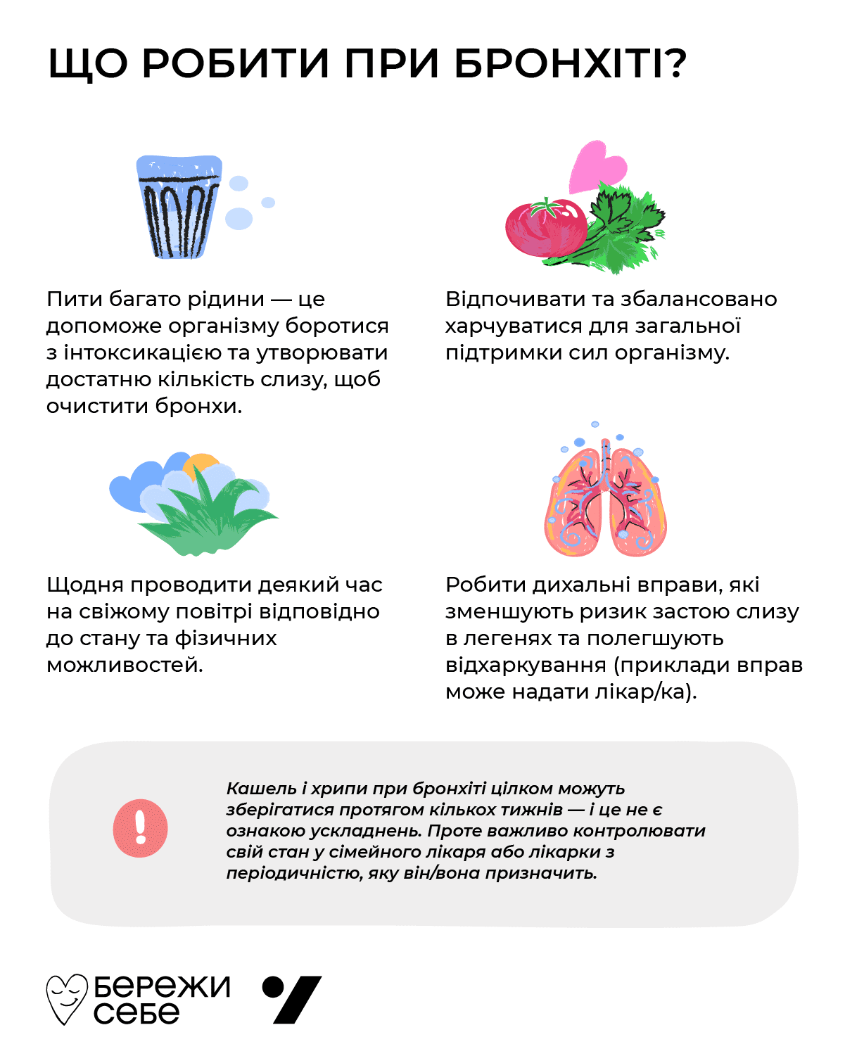Варто розуміти, що кашель і хрипи при бронхіті цілком можуть зберігатися протягом кількох тижнів. І саме по собі це не є ознакою ускладнень. Проте важливо контролювати свій стан у сімейного лікаря або лікарки з періодичністю, яку він/вона призначить.