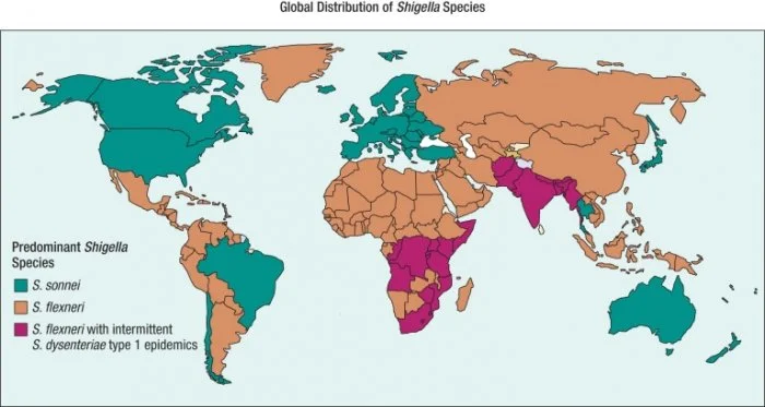 Шигельоз є ендемічним захворюванням для багатьох країн, що розвиваються. По всьому світу захворюваність на шигельоз становить 188 млн. із близько 1 млн смертей щорічно. Більшість випадків (70%) і смертей (60%) виникають серед дітей молодше 5 років. Рід Shigella налічує в собі 4 види бактерій: S, dysenteriae, S. flexneri, S. boydii та S. sonnei. Останні два види мають відносно легкий перебіг, при яких діарея може бути тільки водянистою, без домішок крові. S. flexneri найчастіше викликає ендемічні спалахи та викликає синдром дизентерії. S. dysenteriae відрізняється від інших тим, що: