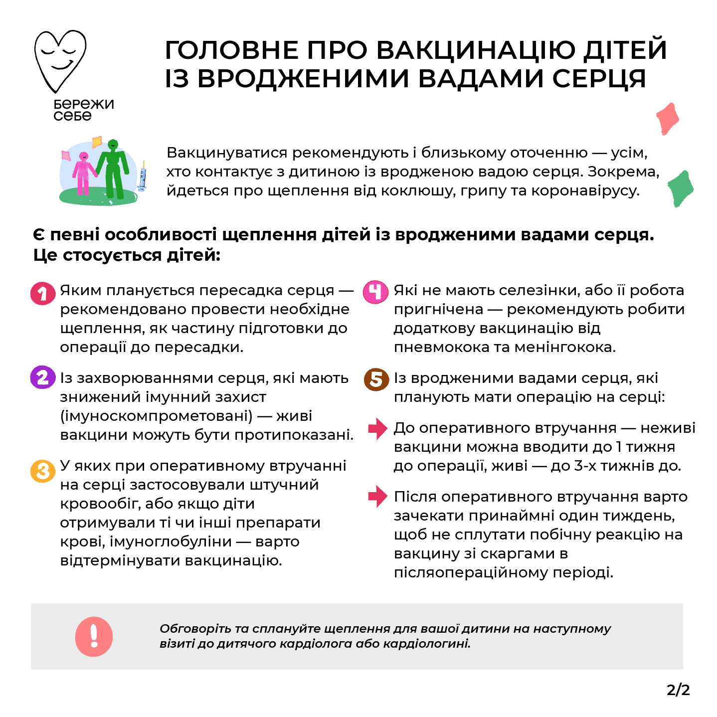 Вакцинація є важливою складовою якісного та здорового повсякдення всіх дітей, зокрема тих, які мають вроджені вади серця. Обовʼязково обговоріть та сплануйте щеплення для вашої дитини на наступному візиті до дитячого кардіолога або кардіологині.