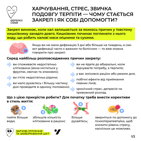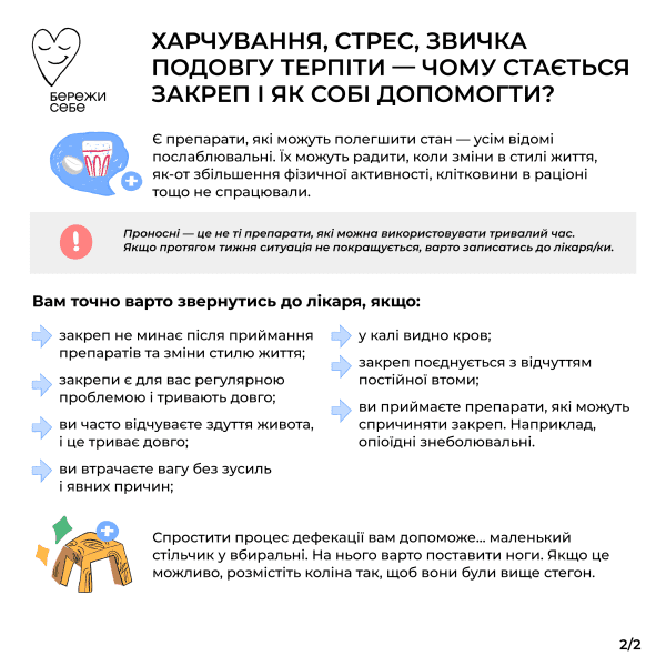 Пам’ятайте — зовсім не соромно проговорювати з лікарем все те, що вас хвилює. Закреп — дуже розповсюджений медичний стан, який буває в кожної людини.
