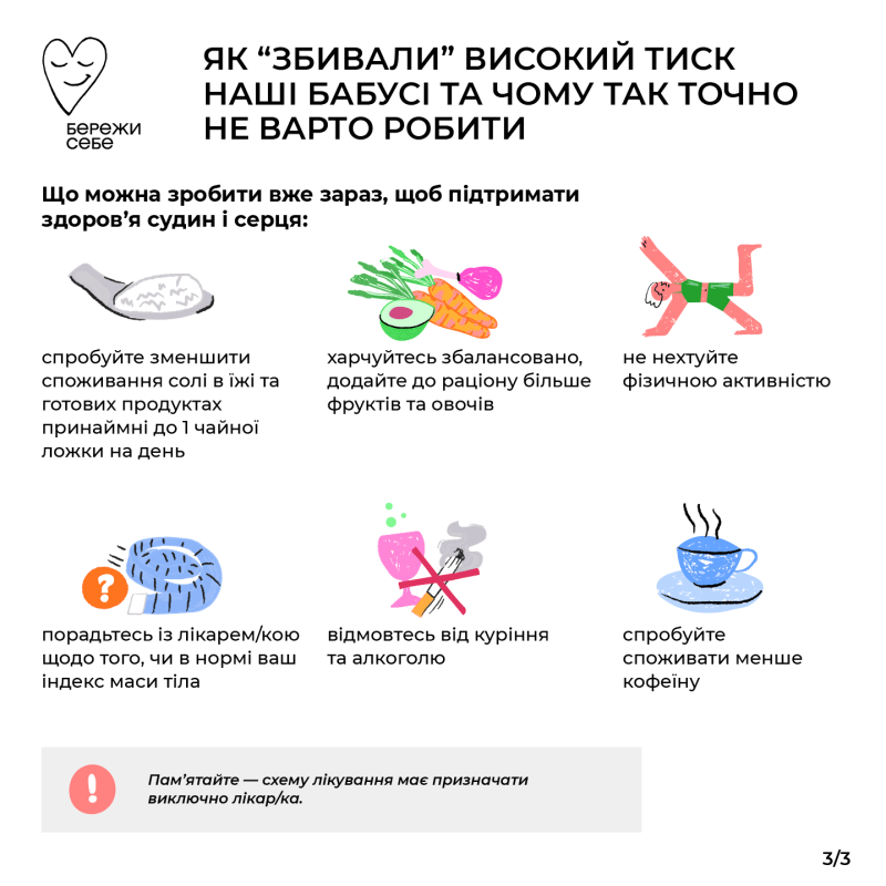 → спробуйте знизити споживання солі принаймні до 1 чайної ложки на день. І йдеться не лише про сіль, яку ви додаєте в їжу, але й про ту, яка міститься в готових продуктах. Наприклад, консервах, випічці тощо;
