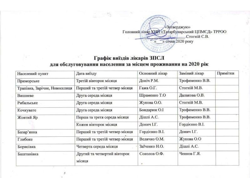 З метою своєчасного та ефективного надання допомоги населенню района затверджений графік виїздів лікарів в неселені пункти, де лікарів не має