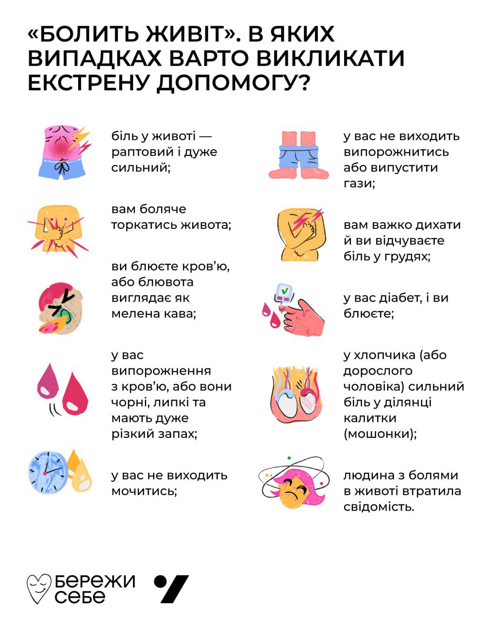 Це доволі поширений неприємний симптом, з яким принаймні раз у житті стикається кожна людина. Зазвичай, випадки болю в животі є безпечними, проте завжди є але. Деякі прояви та суміжні симптоми мають тебе насторожити й спонукати звернутись до лікаря якнайшвидше.