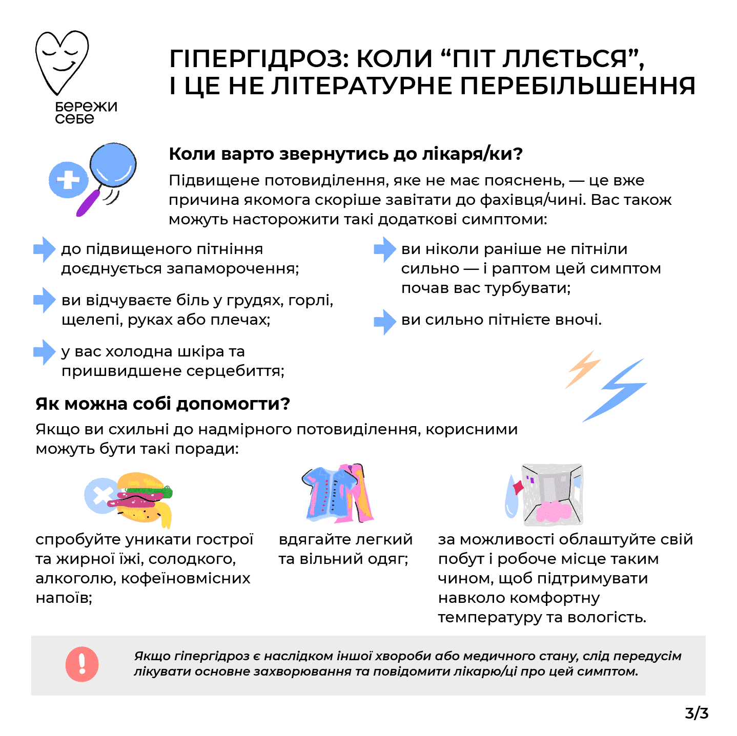 Також пам’ятайте, що пітливість — це захисна реакція організму на підвищення температури. Тож, за можливості, облаштуйте свій побут і робоче місце таким чином, щоб підтримувати навколо комфортну температуру та вологість. Гіпергідроз можна контролювати. Головне, не соромитись звертатись по допомогу.